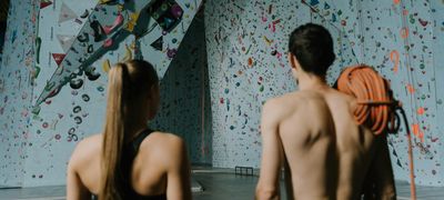 Partager un moment pour s'exercer à l'escalade en bloc : le lieu propose de louer des chaussons pour ceux qui n'en auraient pas !