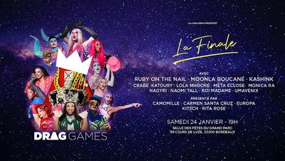 L’heure de la Grande Finale des Drag Games a enfin sonné! 🎉 Plus de 20 artistes sur scène, 9 finalistes, 5 «Maitresses des jeux», 3 Jurys et un·e seul·e gagnant·e… Au cours de cette saison, plus de 30 performeur·ses se sont affronté·es sur la mythique scène des Drag Games, mais seulement 9 d’entre elleux ont gagné le titre de «Tribut» et leur ticket pour la grande bataille finale qui les attend dans «l'arène» de la Salle des Fêtes Bordeaux Grand Parc le 24 janvier prochain! À qui les «juges» de la compétition, Ruby on the Nail de Drag Race France, Moonla Boucané, la grande gagnante de la saison 2 des Drag Games & Kashink, artiste engagé•e internationalement reconnu•e, vont-iels accorder ses faveurs? Qui de Crabe, Katoury, Lola Mhoore, Meta Eclose, Monica Ra, Nagyri, Naomi Tall, Roi Madame ou Umavenix va s’emparer de la couronne et remporter le titre de Champion·ne…