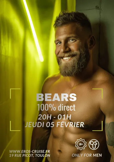 La soirée Bears a lieu à Toulon, au sein du bar cruising naturiste du club Eros Cruise.